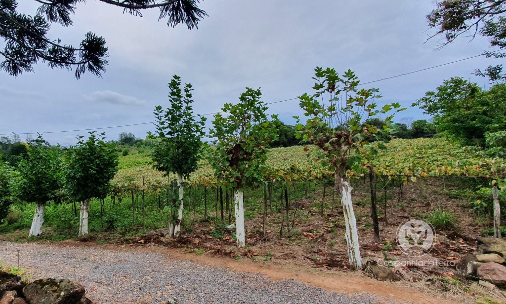 Descrição › Excelente área de terra com 24 hectares localizada no interior de Monte Belo do Sul / RS, sendo 7,72 hectares de parreiras produtivas das seguintes variedades Cora, Seibel, Bordo, Concord, Isabel com uma produção anual de 168,000 kilos. Vista panorâmica com belas paisagens possui 2 casas habitável e mais uma casa histórica e demais benfeitorias. Área ideal para produção agrícola e implantação de atividades voltadas ao turismo.